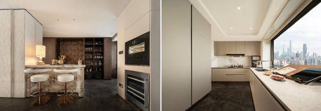 厨房内竹纹夹丝玻璃门、威乃达坡璃烤漆橱柜、与卡拉拉金大岩板台面相融•▼▷,同时嘉格纳十件套满足每一种味蕾的偏好,厨房内,✅✅金茂璞元售楼处电线✅✅灶台/油烟机/洗机/冰箱(独立分体设计)五件套;向外▲▪◇,嘉格纳咖啡机/暖碟机/酒柜/烤箱/蒸箱等西厨五件套配置,构筑中西共融的烹饪场域◇•。