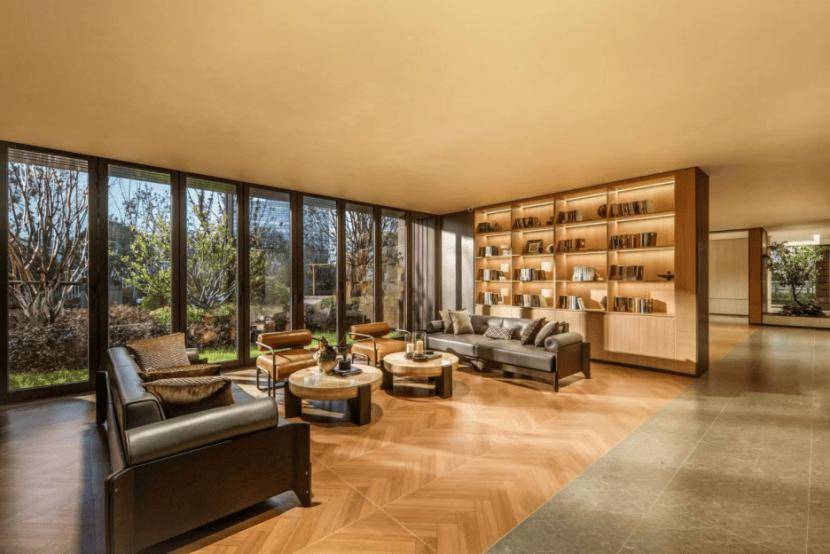 穿过廊庭,步入下沉庭院,3棵近20年树龄的丛生乌桕,霜染叶正红。乌桕林下•,仙鹿雕塑营造出“林深见鹿”的东方意境。抬头望,一方天井★◁,四水归堂,围合一方静谧◁▽,聚天地之灵气。