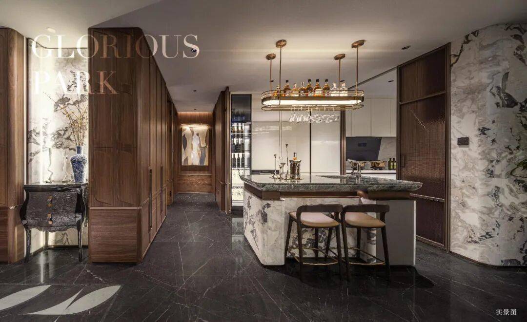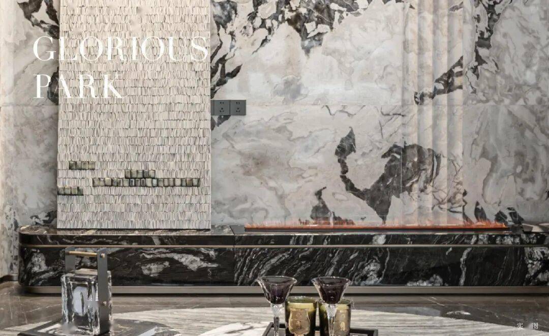从大堂、地库▽▪▽、电梯间,到玄关背景墙▽、客厅电视背景墙●、客厅岛台、主卫镜柜墙,设计师均采用从全球甄选而至的奢石打造△•,经过高级匠人的精心打磨,每一块石材都透露出独有的天然肌理美感,风格厚重而隽永。