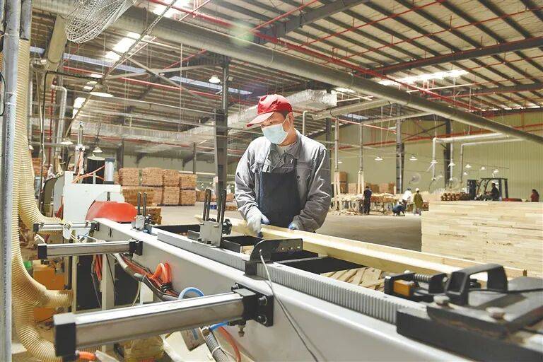 在大同产业园的福成实业(海南)有限公司木材精加工区△,工人在加工木材▪。通讯员 林小丹 摄