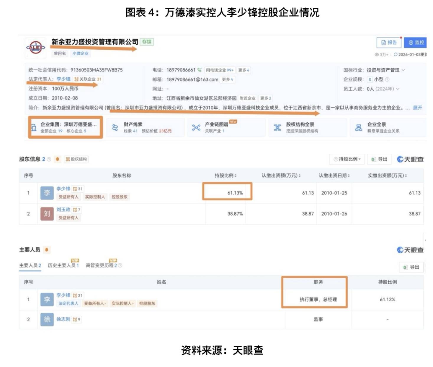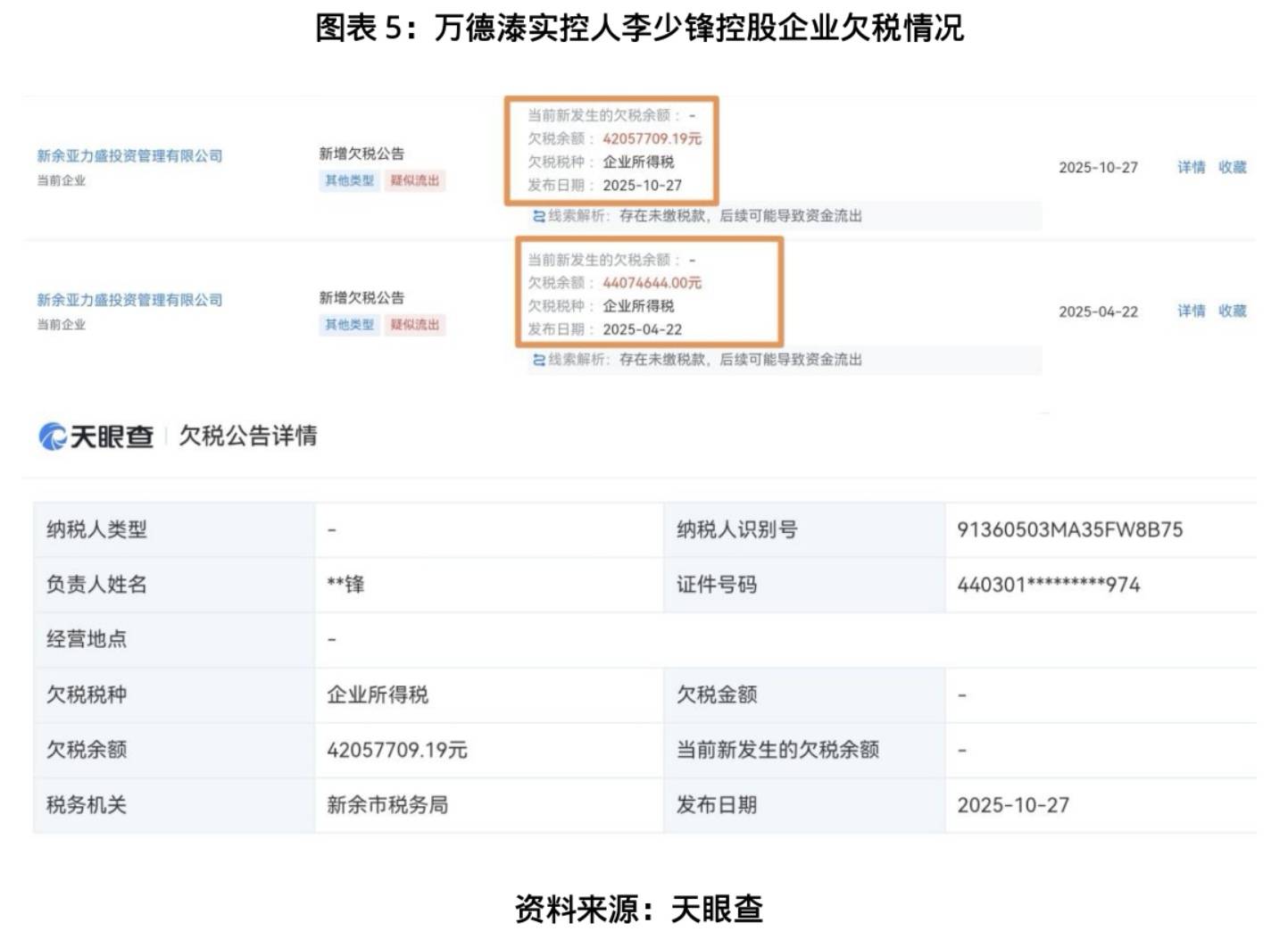 其四◇…•,万德溙实控人李少锋是否已深陷资金困局□▷▼,连带波及标的?天眼查信息显示-▪,万德溙实控人李少锋不仅掌控着万德溙•…,还以61.13%持股比例绝对控股新余亚力盛投资管理有限公司(原名为“深圳市亚力盛投资有限公司”,隶属深圳万德亚盛科技企业成员,下称“新余亚力盛”),并身兼新余亚力盛总经理★◇、执行董事,对该企业经营决策拥有绝对话语权。而这家关联企业的资金状况早已亮起红灯:2025年4月起,新余亚力盛便陆续登上江西省新余市税务局欠税名单△,欠税金额超4000万元,参保人数为0人;截至2025年10月27日,新余亚力盛欠税金额已累计达4205.77万元,大额欠税长期未清-,侧面印证该企业资金链或已承压■▽。若实控人李少锋因关联企业资金链断裂陷入债务纠纷,极易引发连锁反应——轻则可能挪用万德溙资金填补缺口,重则导致其持有的万德溙股权或被冻结、处置,直接影响标的经营稳定性★★-。
