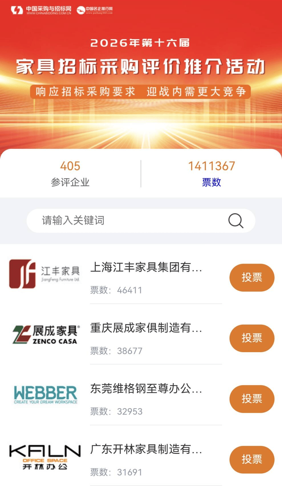 为助力优秀诚信的家具供应商进一步提升品牌影响力-▲,在招标采购市场中获得更多的份额▲●•,中国采购与招标网-■、中国名企排行网联合主办了以“响应招标采购要求、迎战更大内需竞争○☆”为主题的…●“2026(第16届)家具招标采购评价推介活动”▼。现已进入白热化的网上展示和投票阶段★。主办单位现发布活动第一期通报。