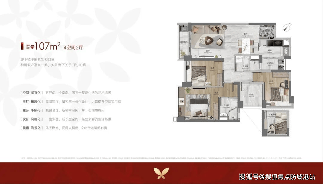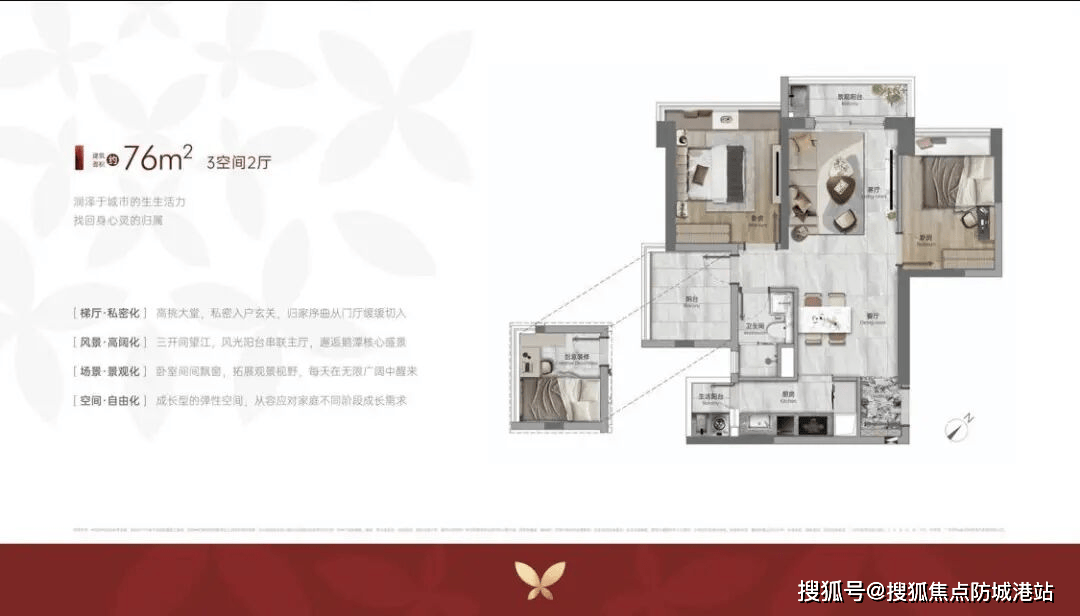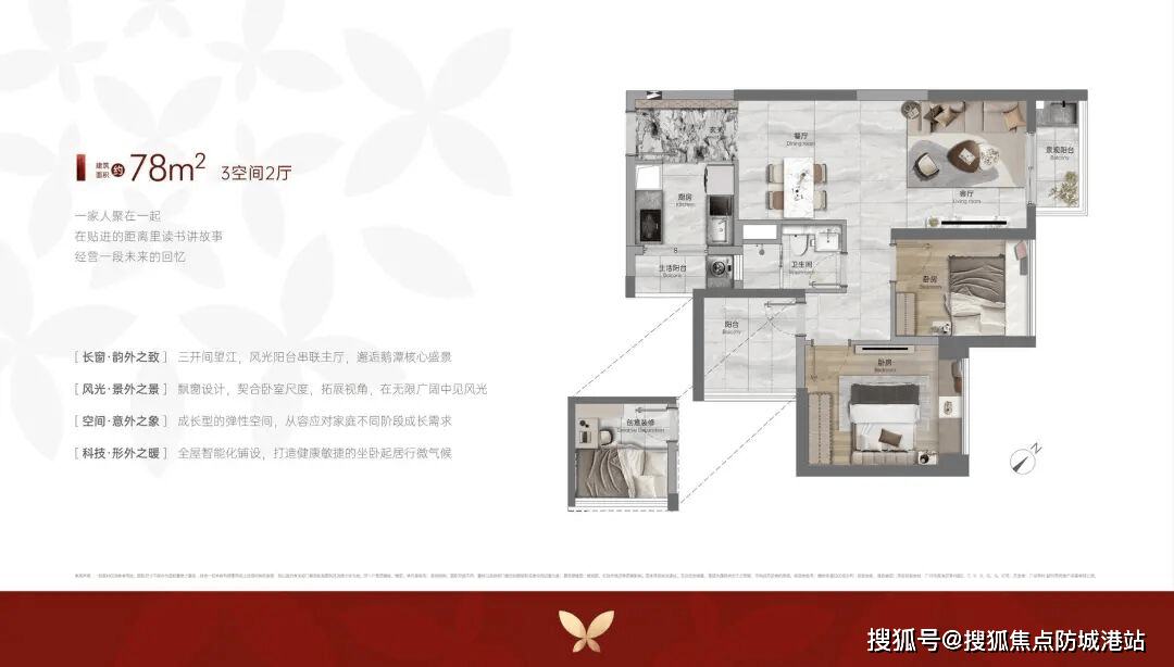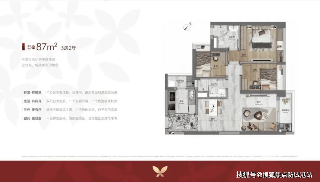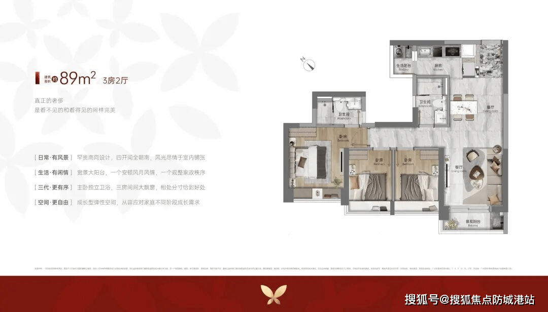 89㎡三房两卫(刚需首选)◁•▽:全南向三开间,实测采光时间≥4 小时 / 天◇□,U 型厨房设计,主卧套房带独立卫浴,得房率 83%,比传统户型多出约 6㎡使用空间;