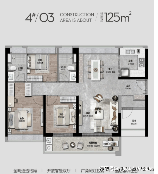 160㎡四房两厅三卫户型:户型布局方正,空间利用率高,四开间朝南,全明设计。客厅采用横厅设计,连接超大观景阳台,270°环幕江景视野,尽显大气;主卧豪华套房•▪,配备独立卫浴-、衣帽间和观景飘窗,享受极致舒适;两个次卧均带飘窗○,采光充足▷,第三个次卧可灵活改造为书房或休闲室;双公共卫生间设计,避免早晚使用高峰拥堵,提升居住便利性。