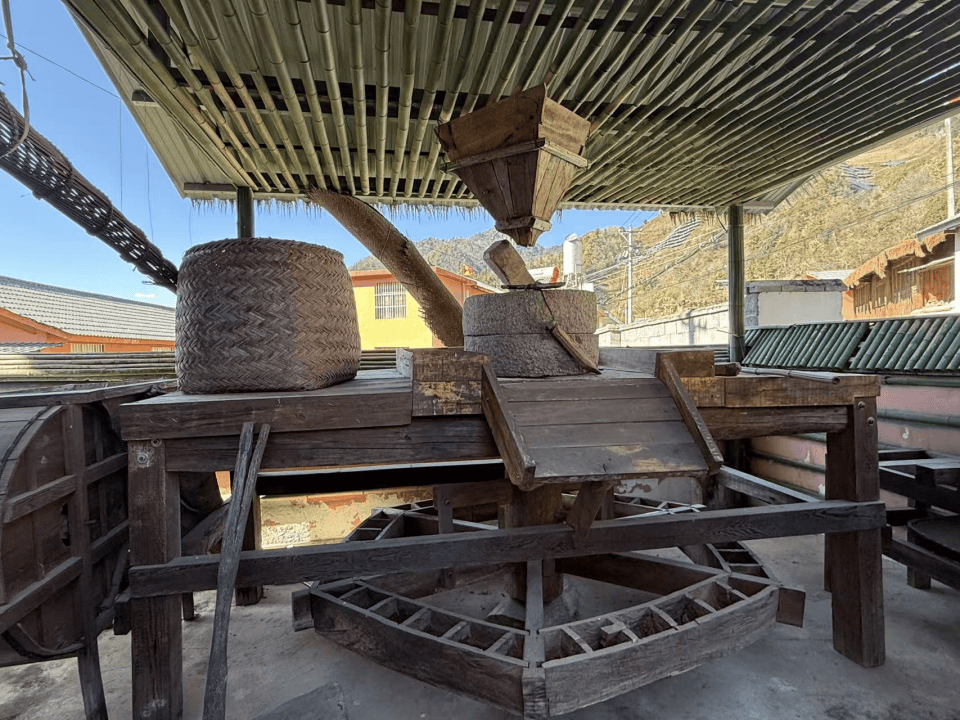 在与农户的交谈过程中,我们了解到渔猎是片马地区传统生计的一种重要补充,主要盛行于九十年代以前。居民会在小江沿岸,通过石头砸击石缝中的鱼类来打鱼,打到的鱼主要供自家食用。同时缘水而居的生存状态●,使得当地茶山人能够制作借助水力的生产工具,其中一种可以带动磨盘的水车极具代表性。