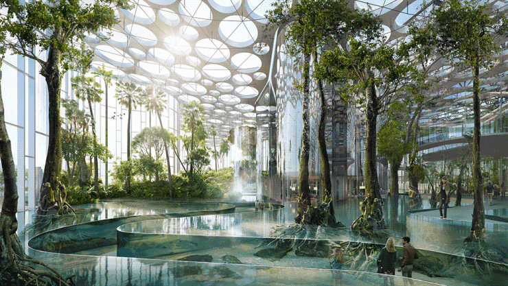 建筑外立面与外滩华尔道夫系出同门,充满未来主义又自带超级网红IP的现代Artdeco风格。底层架空打造了水景大堂,南侧塔楼顶部设计了一座停机坪,这是上海首个也是目前唯一设计顶楼停机坪的住宅。“170米高空私人飞机入户”,匹配多财多亿的富豪阶层。