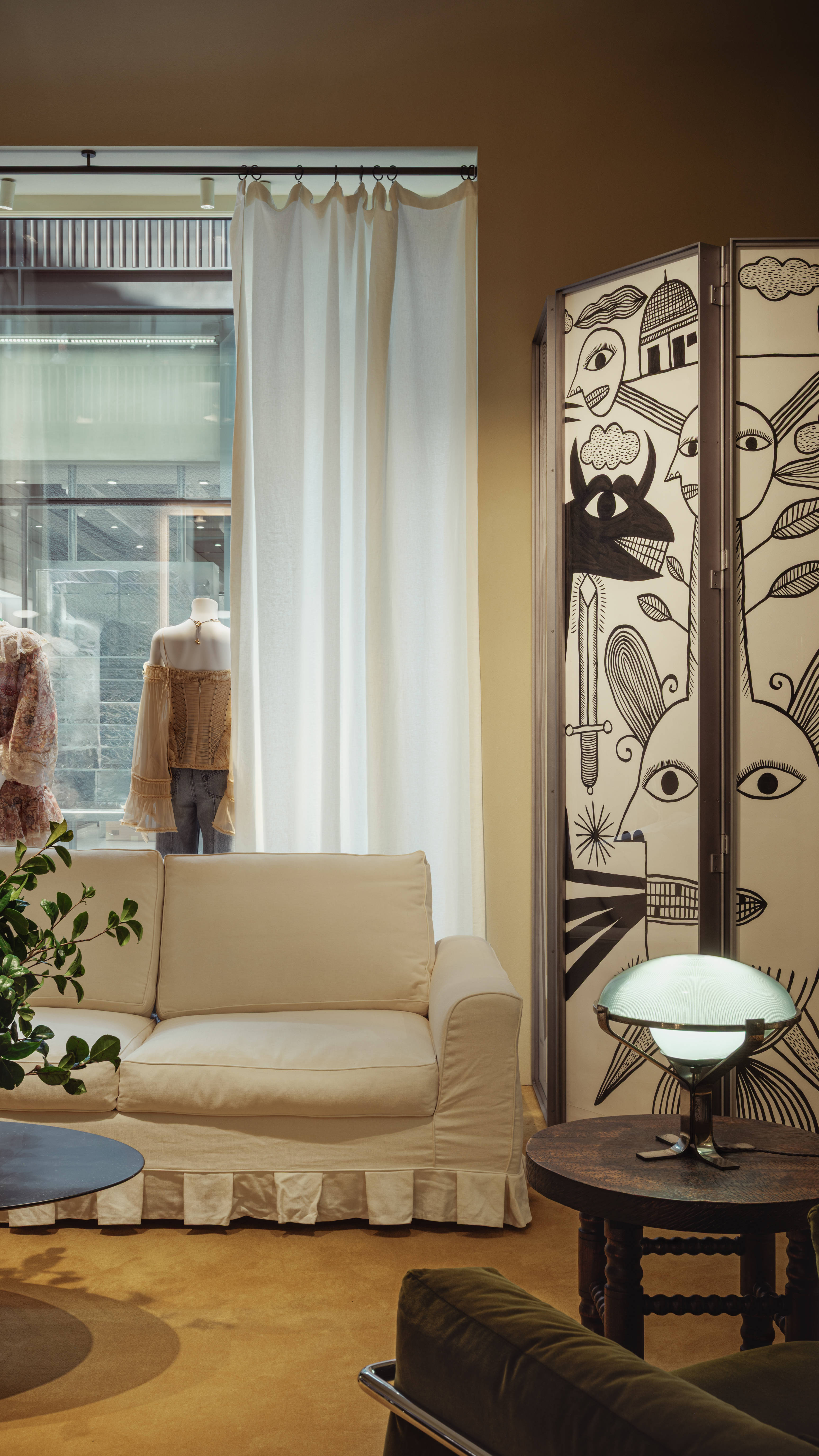 空间氛围在ZIMMERMANN精心甄选的复古灯饰与定制家具共同雕琢下,更显丰盈质感——包含一盏1930 年代Murano 玻璃打造的意大利枝形吊灯,以及一把1940年代Dagobert风格绿天鹅绒扶手椅,为宾客构筑沉浸式体验空间。延续品牌对艺术表达的坚持,澳大利亚艺术家 Peter Cooley 创作的猫头鹰雕塑静驻其间,致敬品牌澳洲渊源。 贵宾休息区以满铺地毯、暖色调墙面与拱形穹顶交织出柔和温馨的惬意氛围。一对绿色天鹅绒扶手椅与定制沙发相对而置,形成质感呼应。空间内设有宽敞试衣间,其中一间以艺术家Arwin Hidayat创作的艺术屏风作为隔断。尽头处的专属预约室则巧妙利用镜面壁龛内置定制坐榻,构筑一隅宁谧空间。