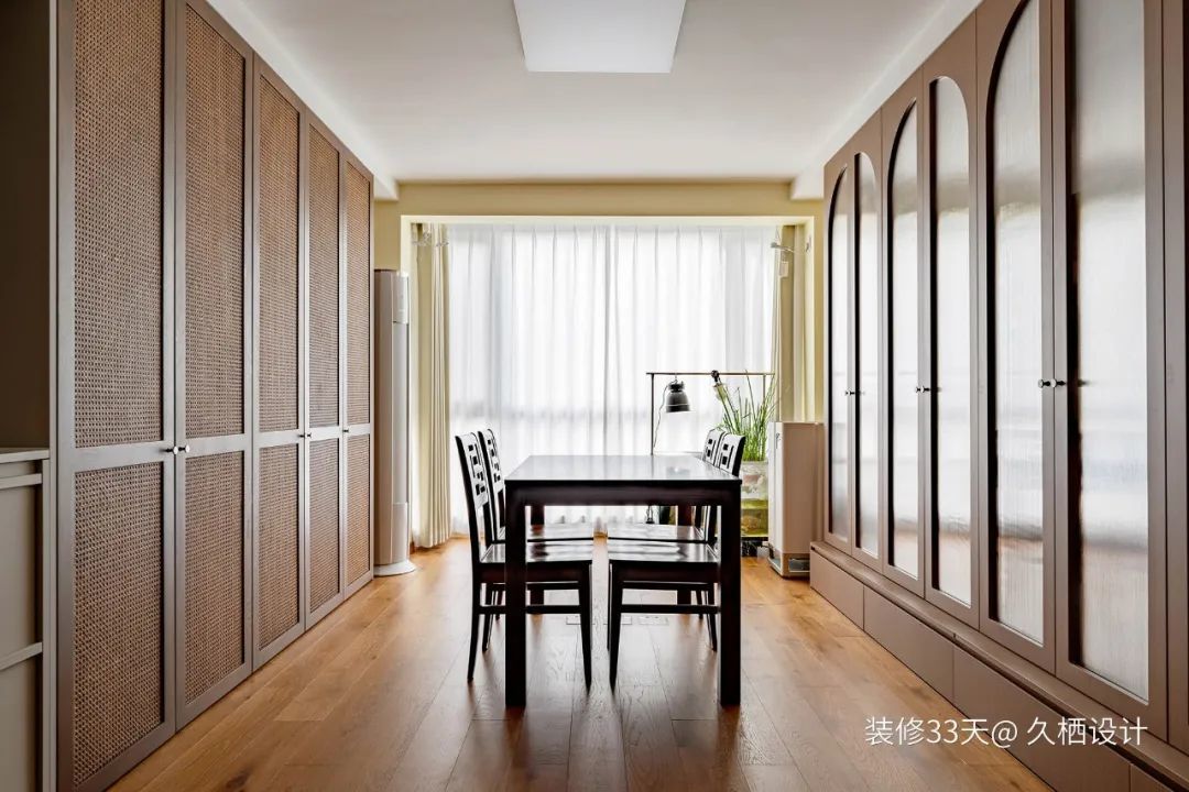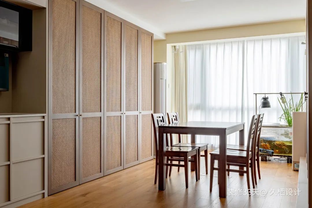 ▲ 一侧做满墙储物柜,藤编平开门一门到顶,腰线cm高,达到视觉统一的效果。古铜色金属把手,搭配胡桃木色藤编木门