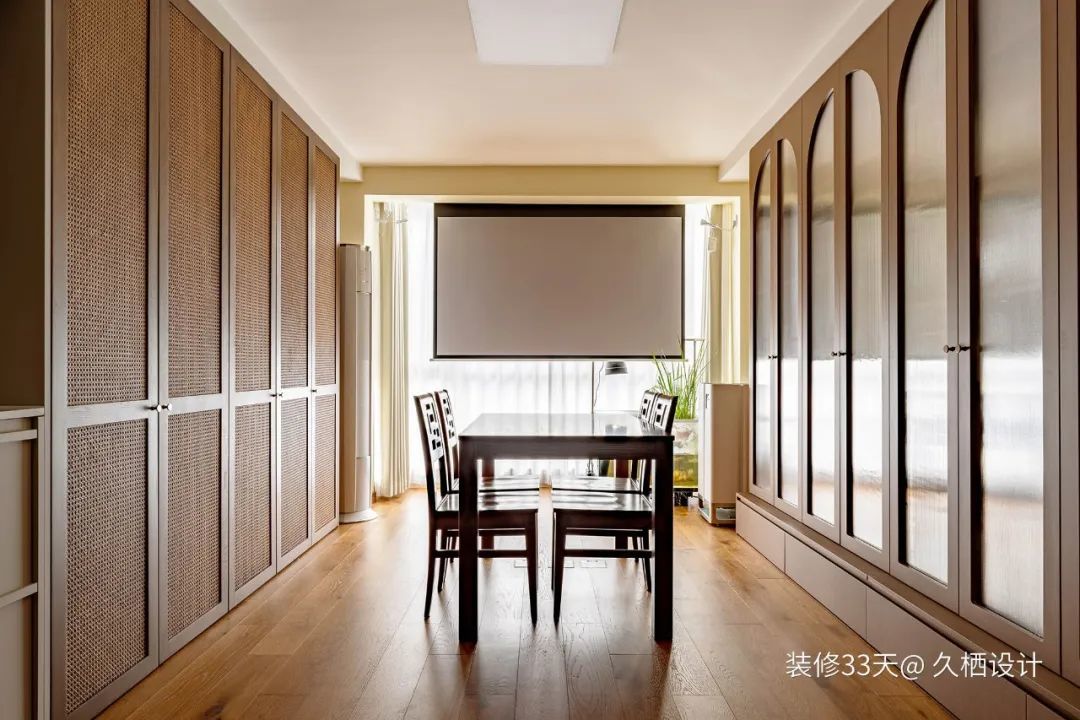 ▲ 为了获取更多的自由空间和实用性,客厅省去大体量的厚重沙发和茶几,中间摆放1.4m实木桌,餐桌兼顾工作台,成了一个办公、学习、阅读、储物的多功能区
