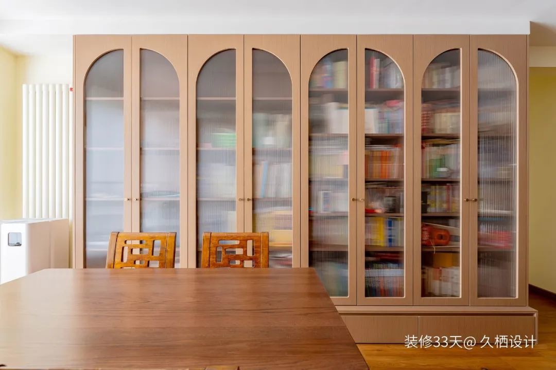 ▲ 深度35cm书柜由四组对开门组成,增加玻璃门板半弧形设计。小灯芯的超白玻璃,既能遮挡书柜的杂乱,又可以增加空间的通透感